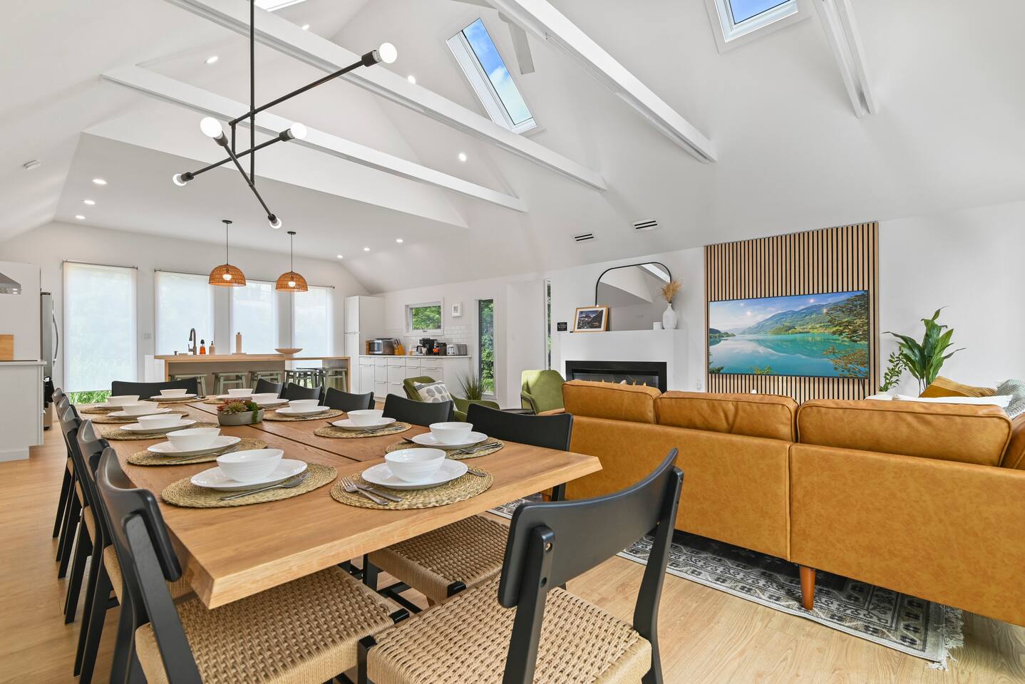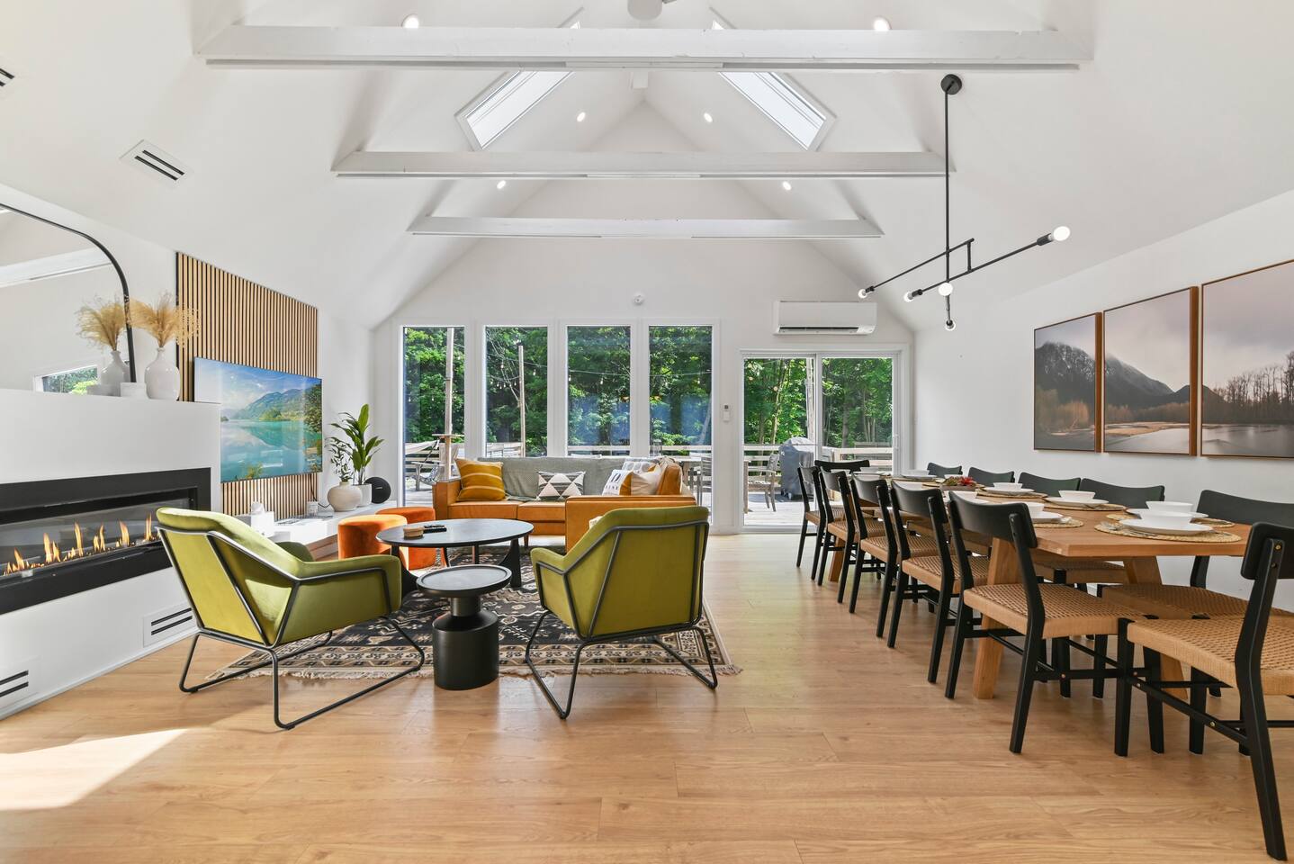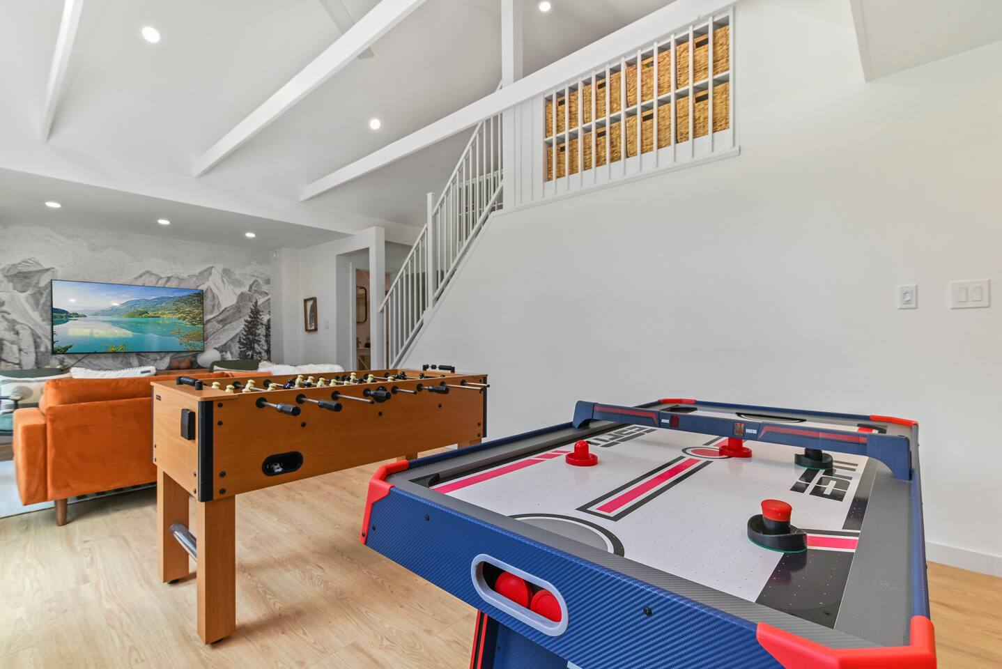 Please take a tour through this breathtaking oasis to familiarize yourself with all the comforts and amenities it offers. The best place to start is the majestic open-concept design living, kitchen and dining area. The home's heartbeat features an entertaining living room with a fully equipped kitchen and an inviting dining area. Warm sunlight touches the elegant décor through windows and skylights, reinforcing the luxurious style under the soaring high ceilings. You can quickly change your settings by stepping into the gorgeous backyard. It offers a private haven with a luxurious hot tub, BBQ grill, magical fire pit, and relaxing hammocks, perfect for romantic stargazing. When you've had enough of the great outdoors, you'll be able to retreat to the game room to have hours of fun playing classic arcade games or have a friendly tournament to decide who takes the crown of the vacation foosball or air hockey champ. Contemporary design and comforts are present in three bedrooms that will have you sleeping like royalty, so you feel rested for whatever you have planned tomorrow. ★ LIVING ROOM ★ The home's focal point is ideal for a fun family gathering. Sit back and relax by the fireplace, put your favorite song on the record player, play it yourself on the guitar, or discuss your plans for days to come. ✔ Comfy Sofa Chairs with Blankets ✔ Gas Fireplace ✔ Record Player ✔ Board Games ✔ Access to the Backyard Sitting by the fire with your loved ones is a gratifying and magical experience, but where's the TV? Worry not, as there are smart TVs in both the living room and game room! ✔ Comfortable L-Shaped Sofa with Pillows & Blankets ✔ 55" Smart TV with Youtube TV, Disney+, Hulu, Netflix ✔ Bluetooth Sound Systems ✔ Stylish Coffee Tables ★ KITCHEN & DINING ★ The fully equipped kitchen comprises of ample cabinetry, spacious countertops, and stainless-steel appliances that allow for the effortless and fun preparation of your favorite meals. ✔ Microwave ✔ Stove ✔ Oven ✔ Toaster ✔ Blender ✔ Coffee Makers (Keurig, French Press, Drip Coffee) ✔ Double-Door Refrigerator/Freezer ✔ Dishwasher ✔ Sink - Hot & Cold Water ✔ Trays ✔ Glasses ✔ Silverware ✔ Pots & Pans ✔ Children's Plates, Bowls, & Silverware Serve those tasty homemade meals and let the smells invite everyone to the dining table. The lovely kitchen island is perfect for a delicious breakfast or a snack. ✔ Dining Table with Seating for 12 ✔ Kitchen Island with Seating for 4 ★ SLEEPING ARRANGEMENTS – 6 BEDROOMS★ Five comfortable bedrooms + the loft bedroom make you feel like you are sleeping on clouds while providing maximum convenience through added amenities. ♛ Master Bedroom: King-Size Bed, Ensuite Bathroom ♛ Bedroom 2: King-Size Bed, Ensuite Bathroom ♛ Bedroom 3: Queen-Size Bed, Ensuite Bathroom ♛ Bedroom 4: Queen-Size Bed ♛ Bedroom 5: Queen-Size Bed ♛ Bedroom 6 (Loft): Two Futons that fold into full-size beds All bedrooms offer a similar set of amenities: ✔ Premium Pillows, Linens, and Sheets ✔ Closets with Hangers and Shelves (Walk-In in Master) ✔ Night Stands with Reading Lamps ★ BATHROOMS ★ The homes features 5 full bathrooms and one half bath. All are stocked with essential toiletries, so you don't need to worry about overpacking. ✔ Walk-In Showers ✔ Vanities ✔ Mirrors ✔ Toilets ✔ Towels ✔ Hair Dryers ✔ Essential Toiletries ★ ARCADE ★ Come to the entertaining ground level to discover numerous relaxing and entertaining amenities. Be careful, though. You'll quickly lose track of time in this fun space! ✔ Arcade Games ✔ Foosball Table ✔ Smart TV with Netflix, Disney+ ✔ Snug Sofa and Chairs ★ FAMILY LOFT ★ Kids or voracious readers will love the loft space above the game room, with many books available for anyone from small children to adults. Nestle up in one of the bean bags and read your favorite book or enjoy some building blocks games with your children. There are 2 additional futons that fold flat into full-size beds, with sheets available in the laundry room. ★ OUTDOOR ★ Enjoy the majestic outdoor ambiance by stepping out in the backyard from the living room, offering a private setting where you can relax in the hot tub, share stories by the fire pit, prepare tasty BBQ, and gaze at the spectacular starry sky while lying on the lounge chairs hammocks. It doesn't get much better than this! ✔ 6-Person Hot Tub ✔ Double Stargazing Hammocks ✔ Fire Pit with Benches ✔ Hanging Egg Chair with String Lights ✔ Teakwood Dining Table ✔ Kids’ Playset w/ swing, slide ✔ Basketball Hoop ✔ Volleyball Net ✔ Soccer goals ✔ Chaise Loungers ✔ BBQ Grill ✔ Upper Patio with a Seating Area ✔ Cornhole ✔ Kan-Jam ✔ Bocce Ball ✔ Glow-in-the-dark pong ✔ Giant Jenga & Giant Connect Four Spend a memorable vacation in this breathtaking mountain home where modern amenities and stylish décor mix with the highest comforts